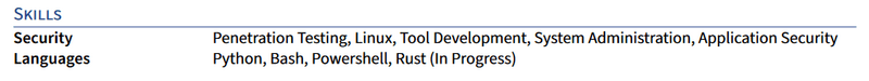 - Certs: A+, Net+, Security+, Project+, Linux+, eJPT, eCPPT, GSEC, GCIH, GSTRT, GPYC, GCIA, GDSA, GCED, GXPN
