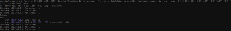 for i in 192.168.1.{1..255}; do echo "Checking $i for access..." ; ssh -o BatchMode=yes root@$i "hostname; whoami; ip -c a | grep -E '[0-9]{1,3}\.[0-9]{1,3}\.[0-9]{1,3}\.[0-9]{1,3}'" 2>/dev/null; done